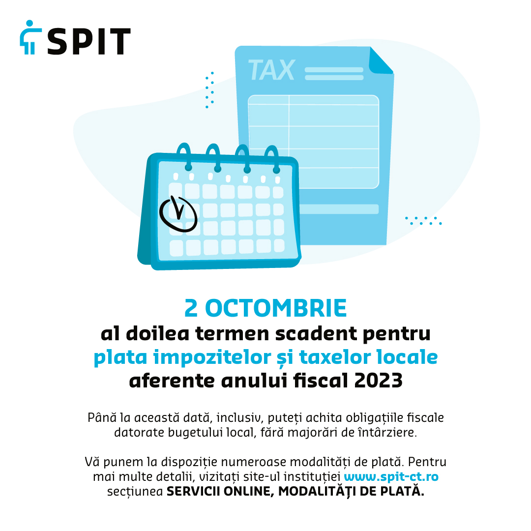 Serviciul Public de Impozite și Taxe Constanța aduce în atenția contribuabililor persoane fizice și juridice, cel de-al doilea termen scadent pentru plata impozitelor și taxelor locale aferente anului fiscal 2023, respectiv data de 30 septembrie.