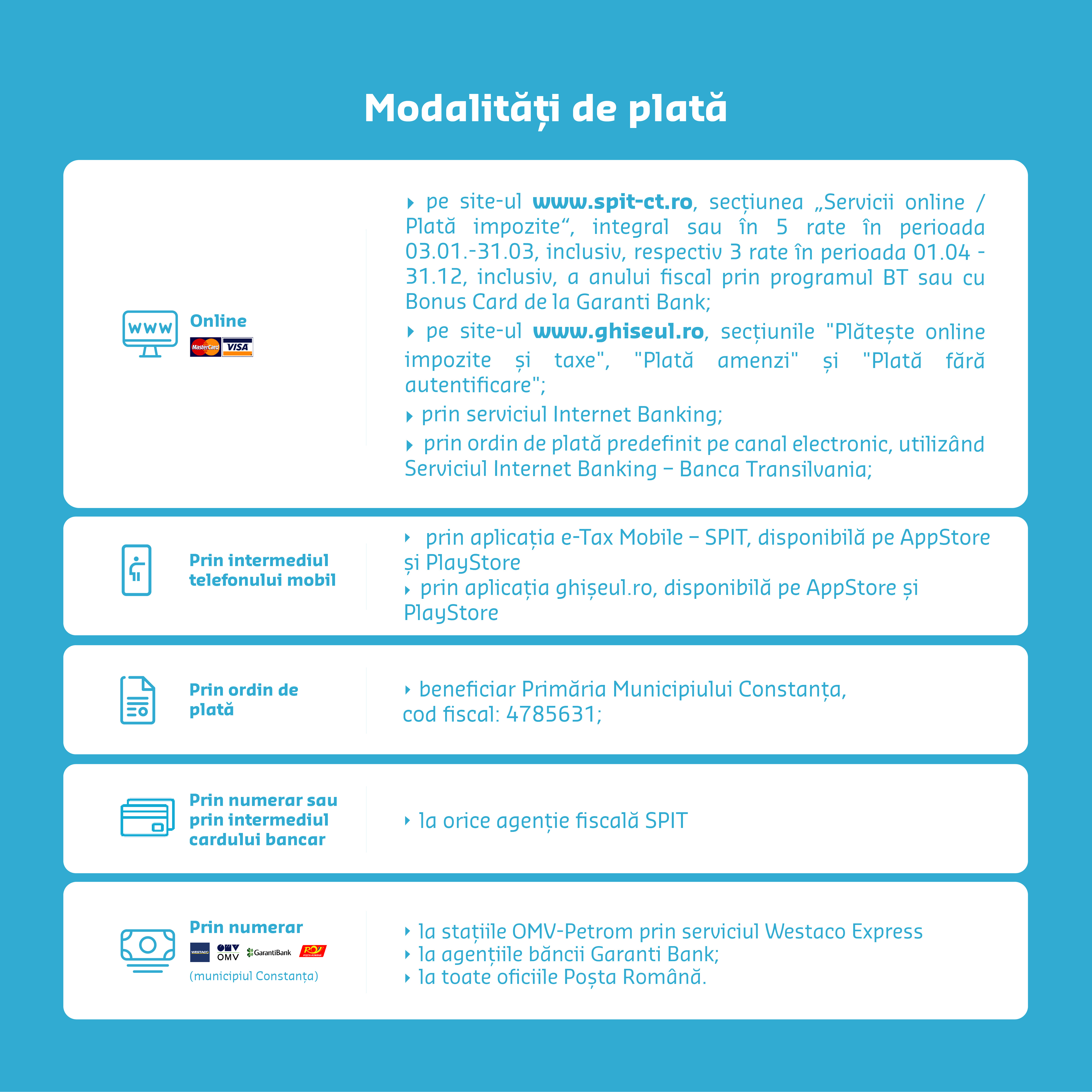 În cazul contribuabililor nou-înființați și a celor care deschid puncte de lucru sau care dobândesc spații situate în stațiunea Mamaia și Sat Vacanță după împlinirea termenului scadent de plată al taxei, respectiv 3 iulie, depunerea declaraţiei şi plata taxei se efectuează în termen de 30 de zile de la data înfiinţării, modificării aduse actului constitutiv/statutului/autorizaţiei de funcţionare sau dobândirii, după caz.
