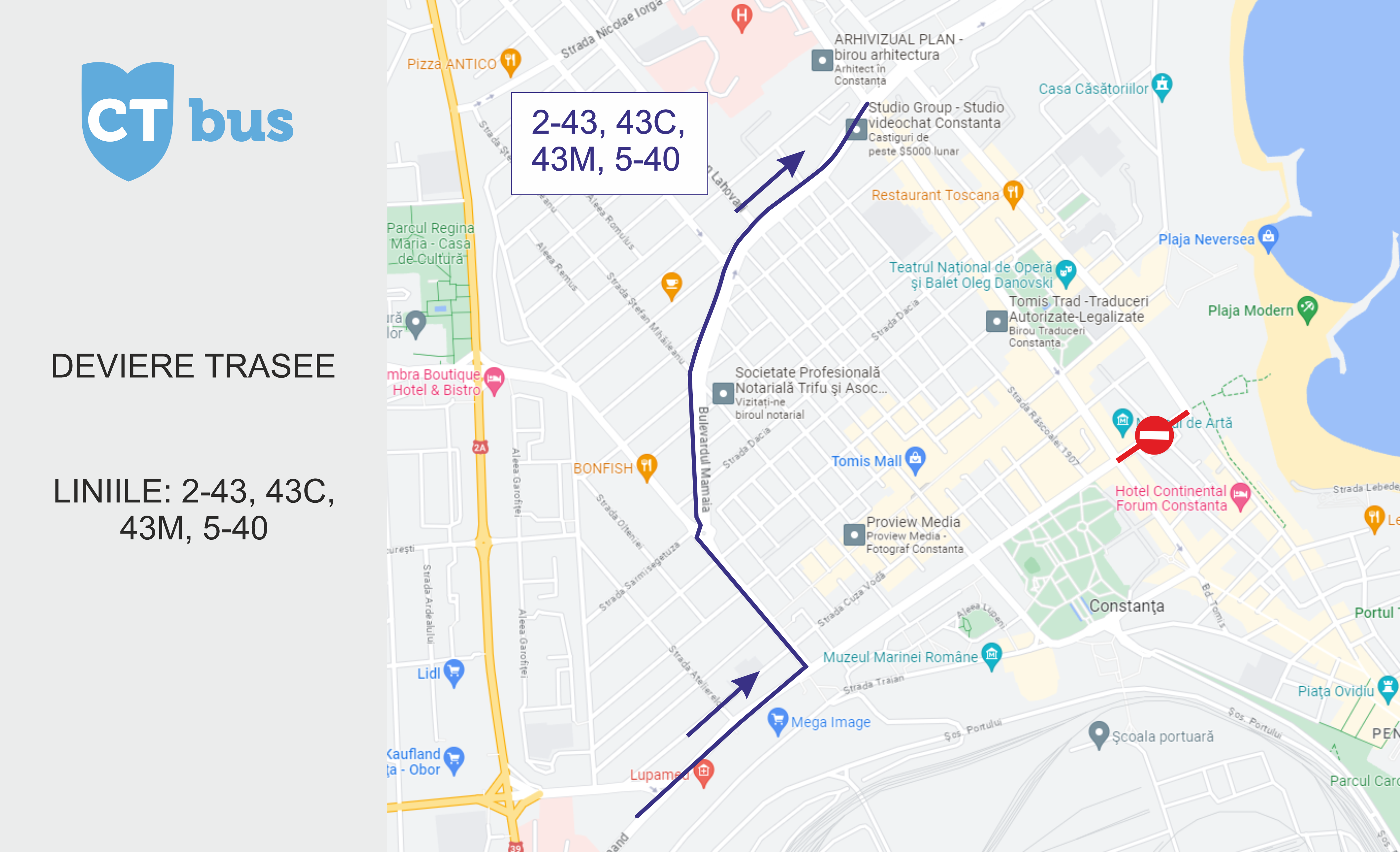 CT BUS anunță publicul călător că, pe 05.07.2023, de la ora 08:00, se deviază liniile care circulă pe bd. Ferdinand, astfel:  - liniile 5-40 – sens către Campus: bd. Ferdinand – str. I.G. Duca – bd. Mamaia – Campus; - sens către Gară: traseu normal; - liniile 2-43, 43 C, 43M, – sens către Cap de linie Cireșica / Carrefour / Vivo: bd. Ferdinand – str. I.G. Duca – bd. Mamaia – bd. Tomis;                                                          - sens către Gară: traseu normal; Devierile survin ca urmare a lucrărilor de asfaltare de pe bd. Ferdinand, între bd. Tomis – str. Mircea cel Bătrân, executate de S.C. Mooz Services S.R.L Programul și traseele pot surveni modificări în funcție de stadiul lucrărilor.
