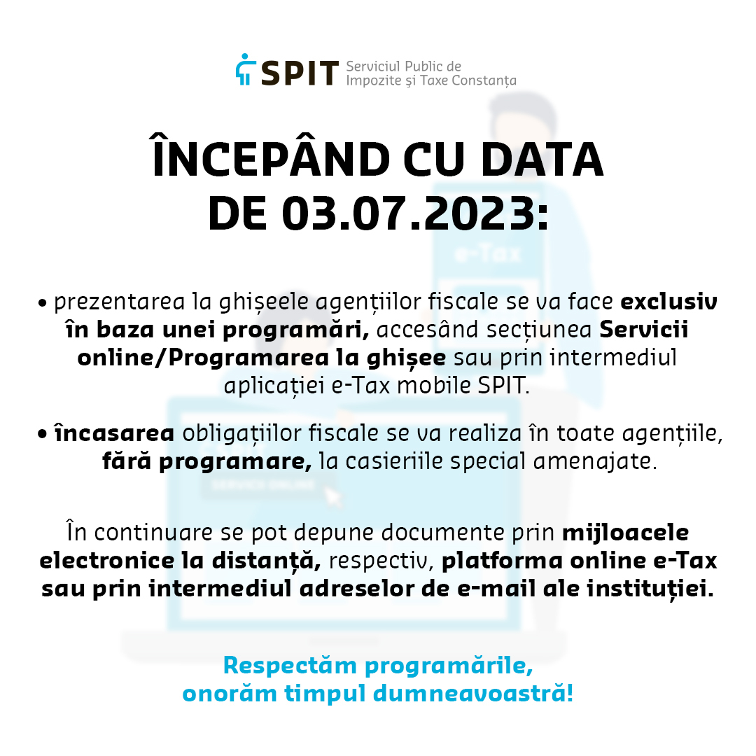 Pe această cale, instituția readuce în atenție și recomandă utilizarea serviciilor publice rapide și sigure, dezvoltate și puse la dispoziție pe website-ul instituției www.spit-ct.ro prin intermediul platformei online e-Tax SPIT.