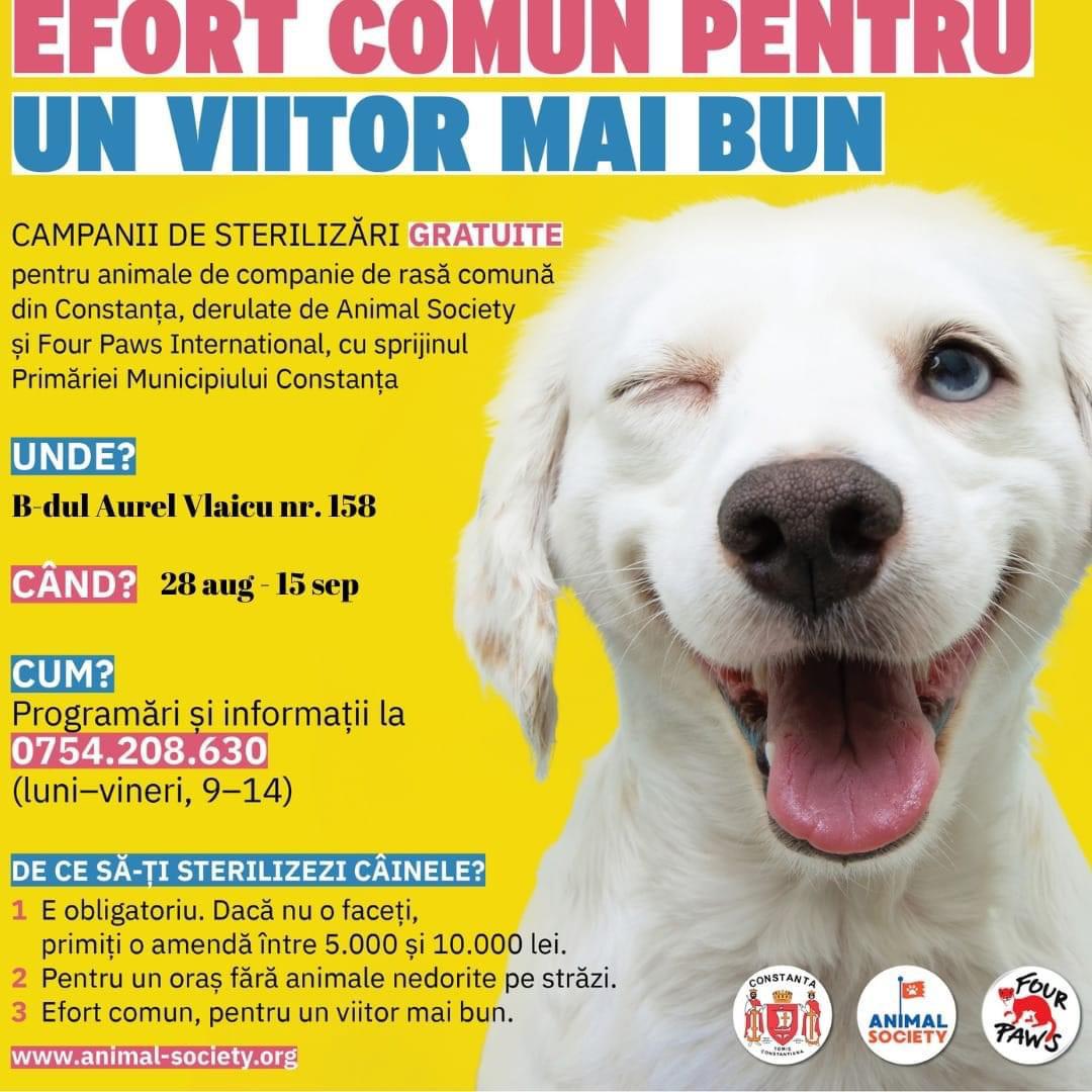 Proiectul „Efort Comun pentru un viitor mai bun“, inițiat de Animal Society și Primăria Municipiului Constanța, presupune desfășurarea mai multor campanii de sterilizare gratuită a animalelor de rasă comună din oraș și derularea mai multor programe de informare adresate constănțenilor, cu scopul implementării unui plan de măsuri uman, eficient, durabil pentru gestionarea înmulțirii necontrolate și a suprapopulației de câini și pisici de rasă comună. Societatea civillă este invitată să se implice în acest proiect și în procesul de luare al deciziilor ce țin de gestionarea animalelor comunității.