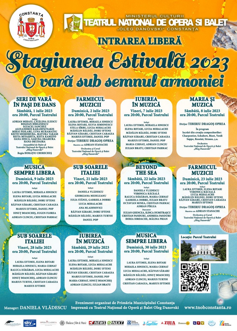 Duminică, 9 iulie, de la ora 20:00, aveți ocazia să vă întâlniți cu capodoperele muzicii vocal instrumentale în spectacolul „Musica sempre libera”. Vor interpreta pentru dumneavoastră soliștii: Laura Eftimie, Mihaela Ionescu, Elena Rotari, Lucia Mihalache, Mădălin Băldău, Doru Iftene, Răzvan Săraru, Cristian Caragea, Marius Eftimie, Daniel Pop, Ionuț Boancheș, Eugen Florea, Adrian Clinciu, Cristian Parmac.