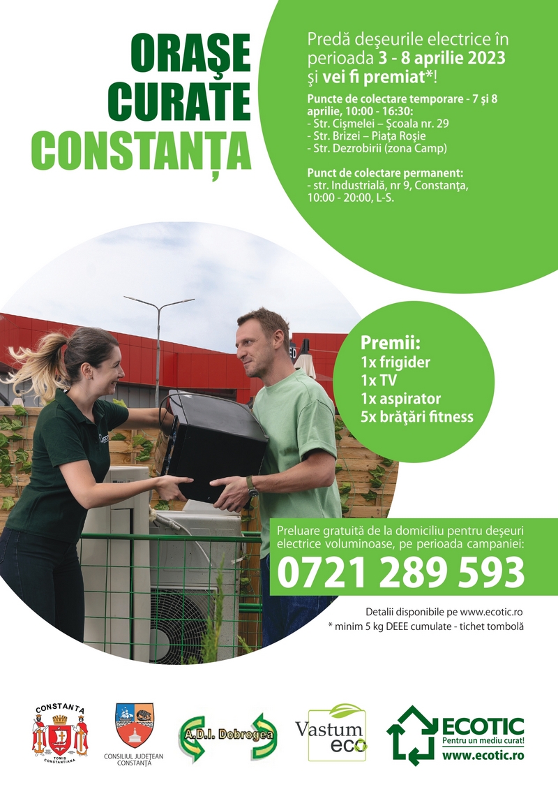 De asemenea, în această perioadă, constănțenii beneficiază de preluarea gratuită de la domiciliu a deșeurilor electrice, electronice sau electrocasnice de mari dimensiuni. Comanda de preluare se va face telefonic la numărul de telefon 0721289593.