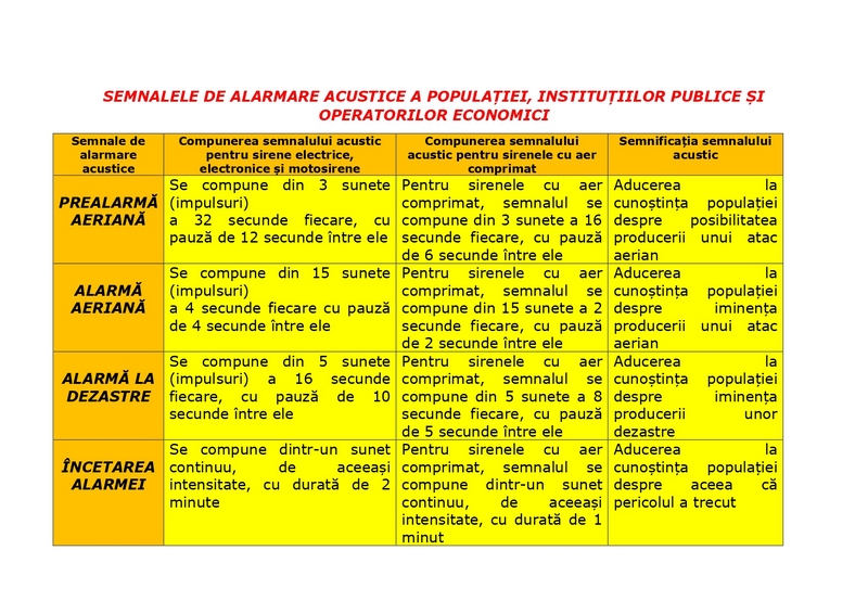 a) Semnalul ALARMĂ AERIANĂ se compune din 15 sunete a 4 secunde fiecare, cu pauză de 4 secunde între ele. Pentru sirenele cu aer comprimat semnalul se compune din 15 sunete a 2 secunde fiecare, cu pauză de 2 secunde între ele. Semnificație: Prevenirea populației despre apariția pericolului imediat de lovire a obiectivului, respectiv localității.