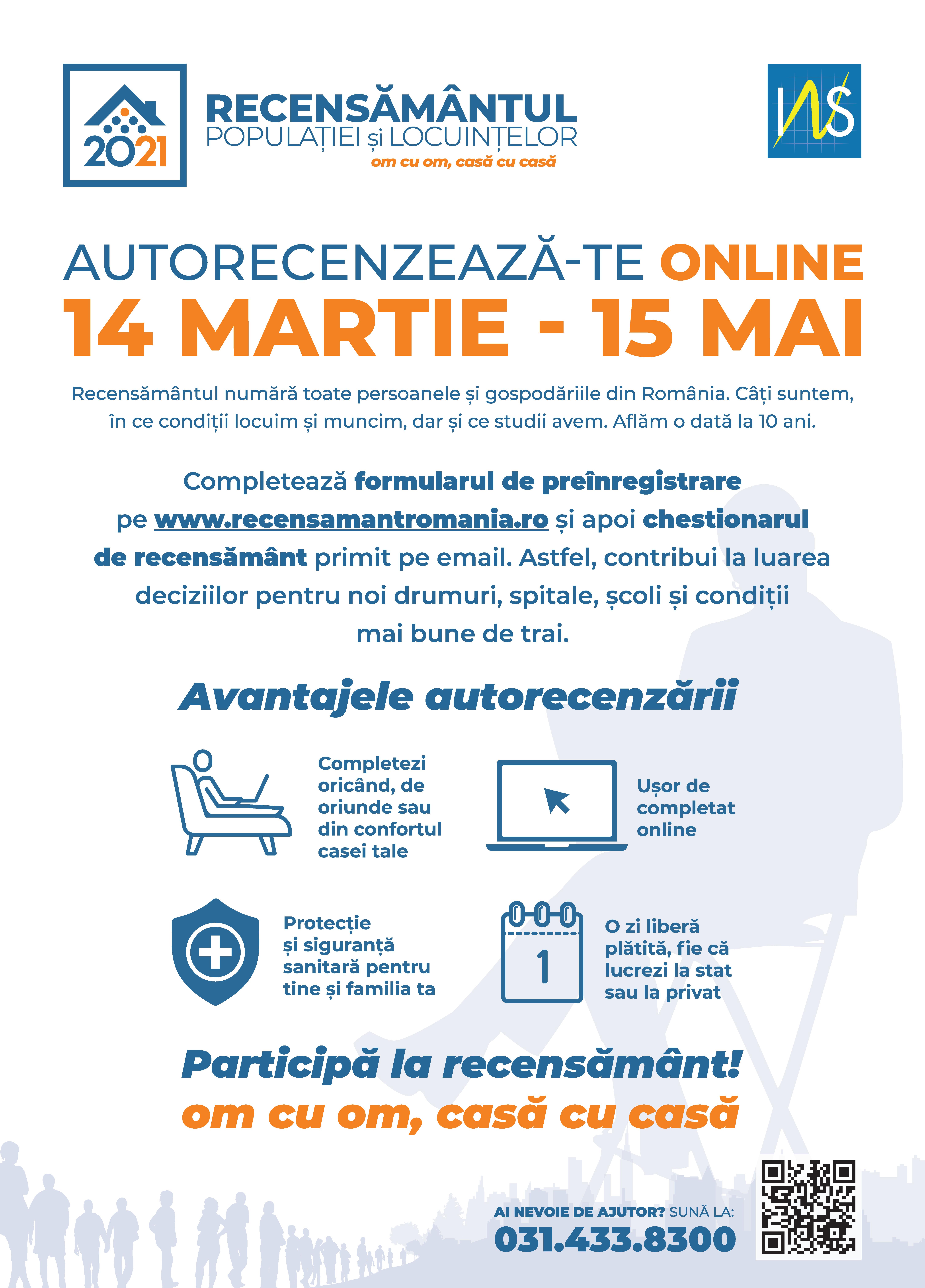 Începând cu 14 martie 2022 debutează etapa de autorecenzare a Recensământului populației și locuințelor 2021