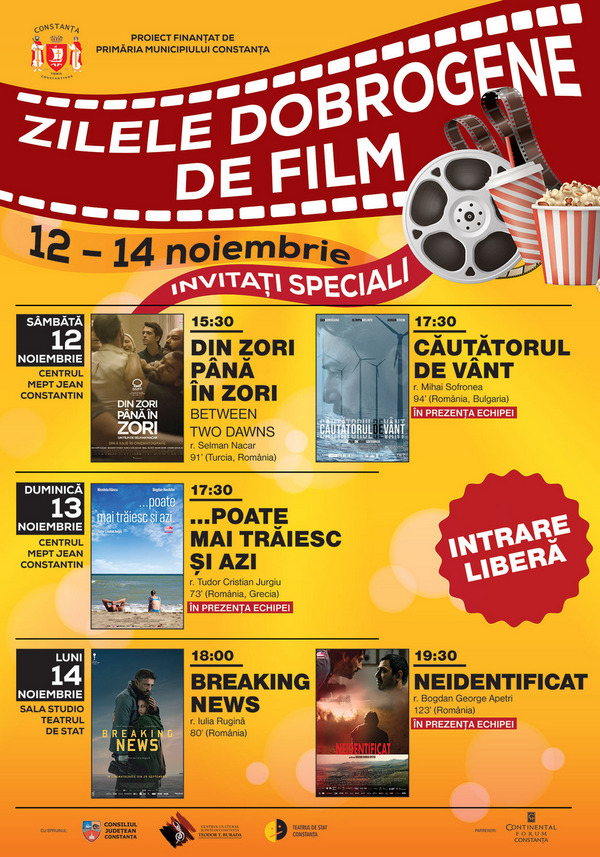 În perioada 12 – 14 noiembrie, la Constanța au loc Zilele Dobrogene de Film. Evenimentul, finanțat de Primăria Municipiului Constanța, propune publicului o serie de proiecții de filme românești și străine co-produse de cineaști din țări aflate în regiunea Mării Negre sau filmate în zona Dobrogei. Intrarea la proiecții este gratuită, iar acestea vor avea loc la Centrul Multifuncțional Educațional Pentru Tineret „Jean Constantin” (Bulevardul Ferdinand 56) și la Sala Studio a Teatrului de Stat Constanța (Strada Lahovari Ion 2). În plus, la eveniment vor participa actori precum Olimpia Melinte, Bogdan Farcaș sau Nicoleta Hâncu, care vor sta de vorbă cu publicul la finalul proiecțiilor.