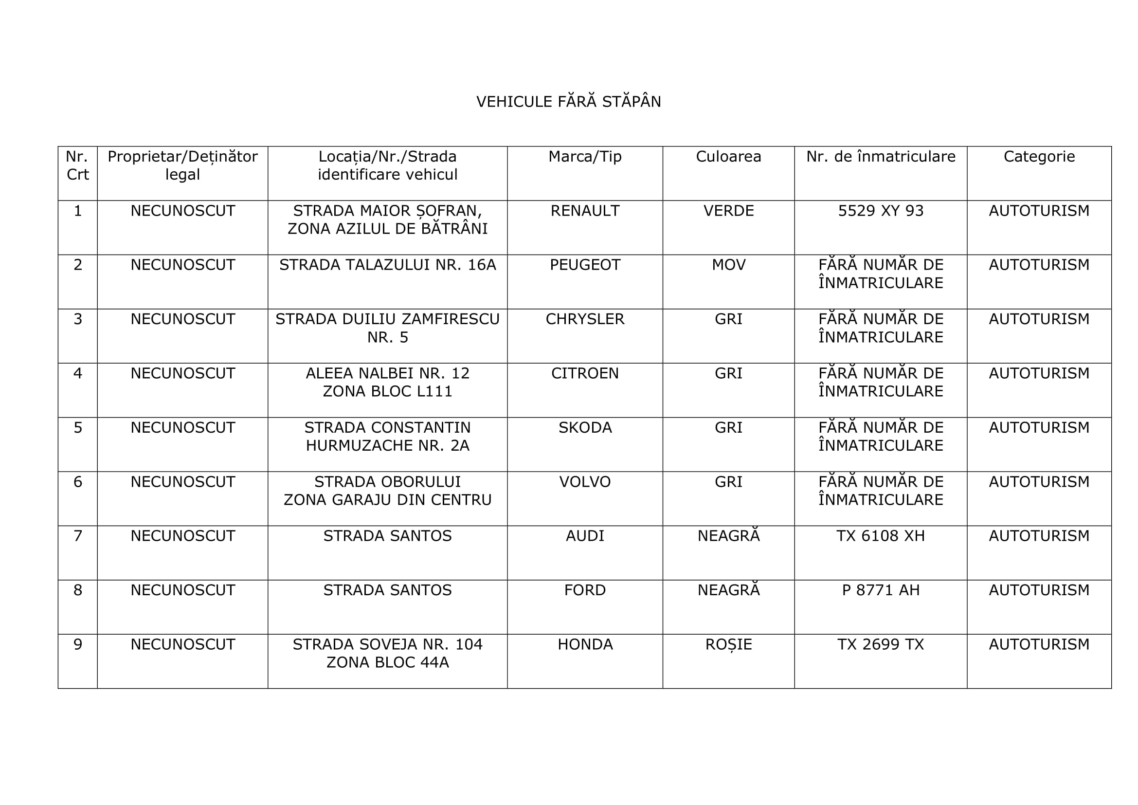 Menționăm că pentru a fi declarate fără stăpân sau abandonate autovehiculele trebuie să îndeplinească cumulativ condițiile prevăzute de Legea nr. 421/2002 privind regimul juridic al vehiculelor fără stăpân sau abandonate, respectiv fără plăcuță de înmatriculare sau alte marcaje oficiale ori înmatriculate în străinătate, al cărui proprietar sau deținător legal este necunoscut, sau aflat de cel puțin 6 luni pe domeniul public sau al cărui proprietar sau deținător legal este cunoscut, însă exista indicii temeinice că acesta nu respectă condițiile legale pentru a circula pe drumurile publice.