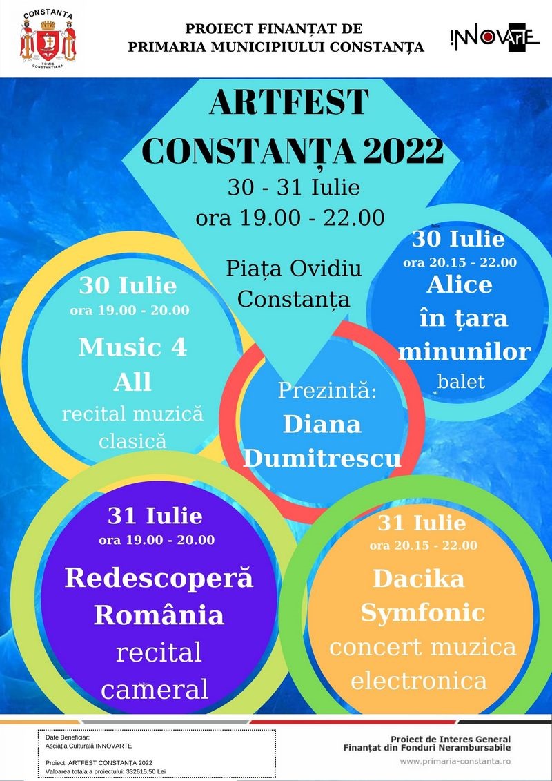 organizează în perioada 30 - 31 Iulie în Piața Ovidiu Constanța evenimentul cultural “ARTFEST CONSTANȚA 2022”, proiect finanțat de Primăria Municipiului Constanța care va aduce în fața publicului momente de muzică clasică, muzică electronică monumentală (cu instrumente electrice și clasice, orchestră simfonică și cor), recitaluri instrumentale și vocal-instrumentale precum și o impresionantă producție coregrafică în care se îmbină cu deosebit succes baletul clasic cu dansul contemporan, evenimentul fiind prezentat de actrița Diana Dumitrescu.