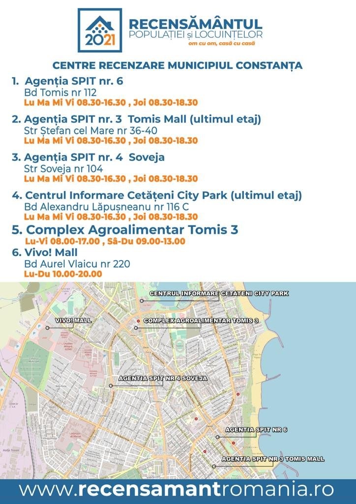 Pentru a putea intra în contact cu recenzorul dumneavoastră de zonă, orice lămuriri și întrebări referitoare la procesul de recenzare și la recensământul populației și locuințelor, puteți apela Call Center la 0314338333 sau telefoanele Unității Județene de Implementare a Recensământului Constanța: 0752221010, 0770853384, 0770853519 sau 0752225099.