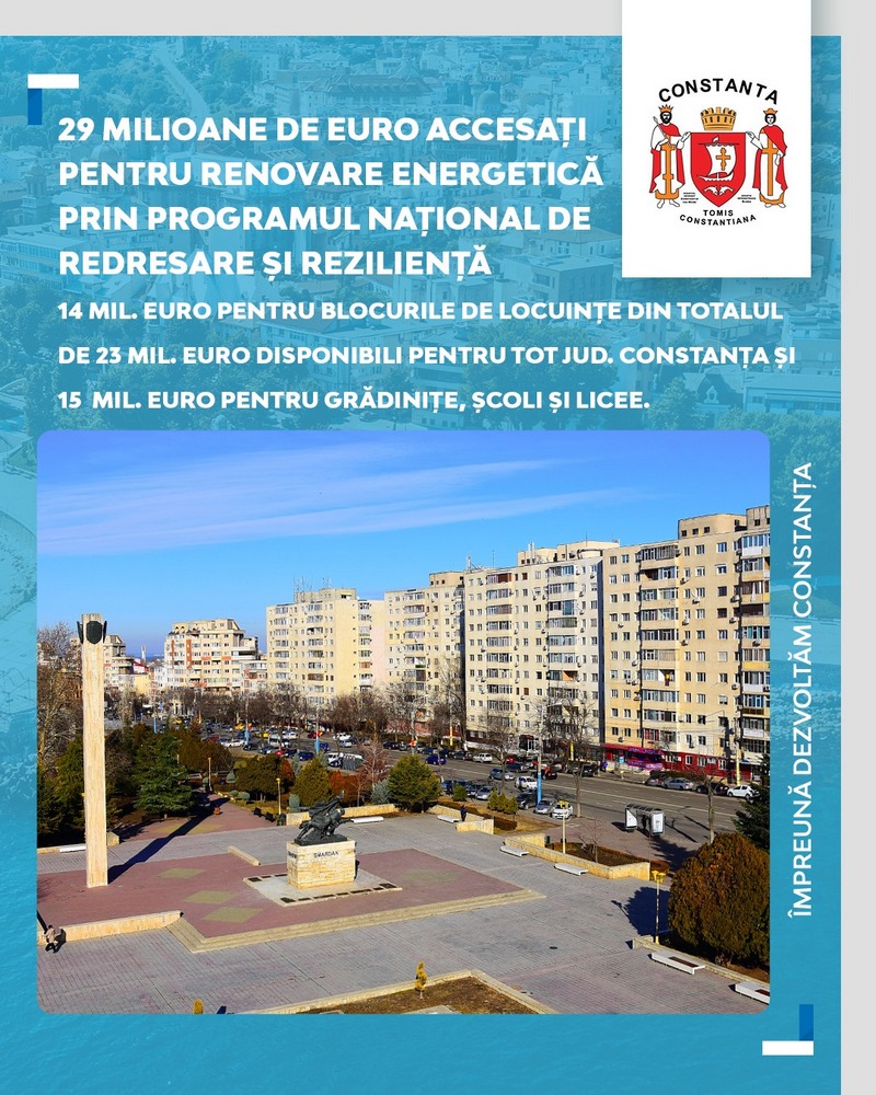 Primăria Municipiului Constanța a accesat circa 14 milioane de euro totalul de 23 de milioane de euro disponibili pentru întreg județul Constanța, în vederea renovării energetice a clădirilor rezidențiale. În plus s-au accesat alte 15 milioane de euro pentru renovarea energetică a clădirilor publice, urcând totalul accesat la 29 milioane de euro.