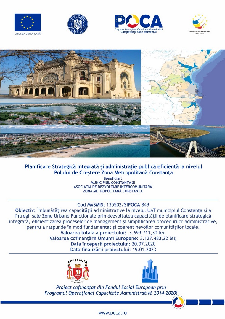 Primaria Municipiului Constanta, împreună cu celelalte autorități publice locale din Zona Metropolitană Constanța, actualizează Strategia Integrată de Dezvoltare Urbană pentru Polul de Creștere Constanța (SIDU Constanța) și pregătește portofoliul de proiecte pentru perioada 2022-2030.